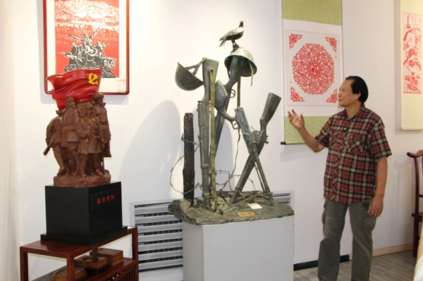 “這件作品我命名為《和平》,取材于抗日戰(zhàn)爭(zhēng)時(shí)期八路軍使用的機(jī)槍、三八大蓋、鐵絲網(wǎng)和鋼盔等元素,頂部是一只象征和平的鴿子,寓意銘記歷史、珍愛和平,不忘初心、開創(chuàng)未來?!敝袊?guó)工藝美術(shù)大師傅紹相向參觀者介紹道。作為縣文聯(lián)副主席、縣民間文藝家協(xié)會(huì)主席,他不僅是本次展覽的重要組織者,也是參展藝術(shù)家之一,《和平》正是他為本展特別創(chuàng)作的作品之一。