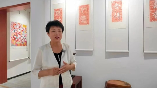 縣民間文藝家協(xié)會(huì)會(huì)員劉玉鑾介紹傳拓作品《二字吉祥語(yǔ)》