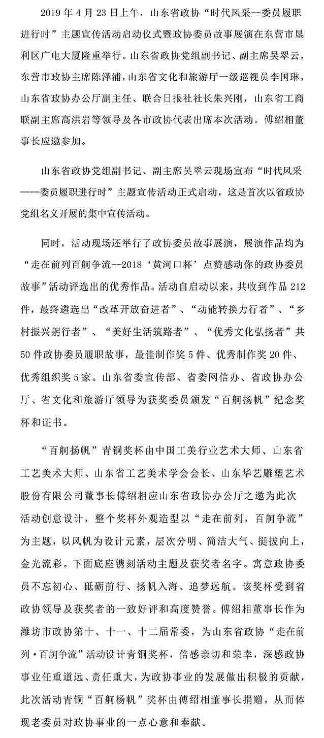 2019年4月23日上午,山東省政協(xié)“時(shí)代風(fēng)采--委員履職進(jìn)行時(shí)”主題宣傳活動(dòng)啟動(dòng)儀式暨政協(xié)委員故事展演在東營(yíng)市墾利區(qū)廣電大廈隆重舉行。